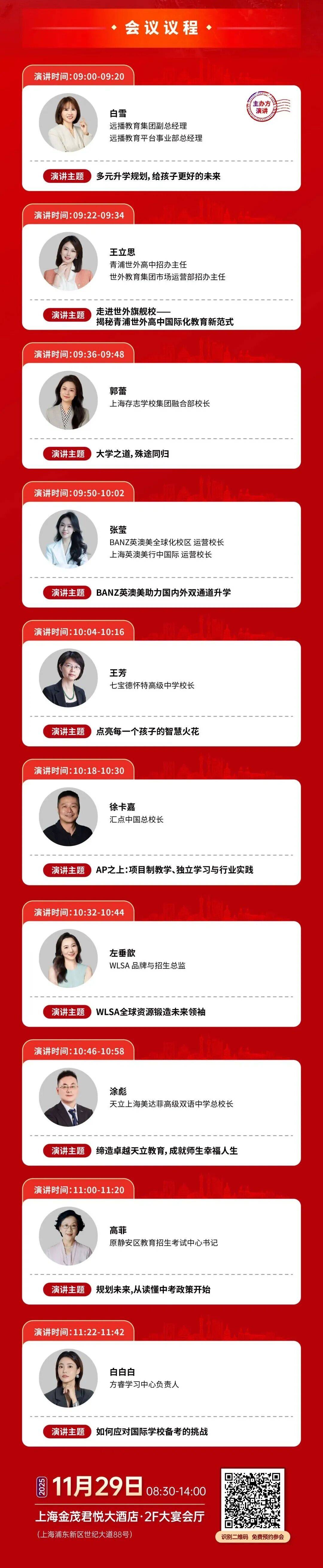 咨询会邀请10位国际学校校长、招生官、教育大咖,从英美澳加到日本、中国香港,从体制内中考解析到体制外留学路径规划,与家长现场对话,直击国际教育难题,为您的教育选择提供精准导航!