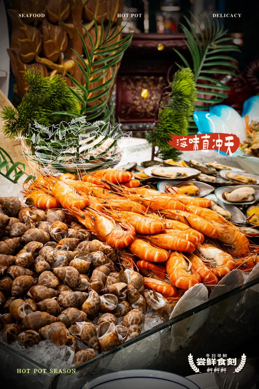 配菜更是丰富多样,多达几十种荤素食材任君挑选。鲜切牛肉纹理清晰,入口鲜嫩多汁;胸口油脆爽弹牙,越嚼越香;牛百叶爽滑劲道,在锅中稍涮片刻,便裹满浓郁汤汁。生猛海鲜区,螃蟹、虾、贝类等新鲜生猛,仿佛将大海的鲜活滋味直接搬到了餐桌上。
