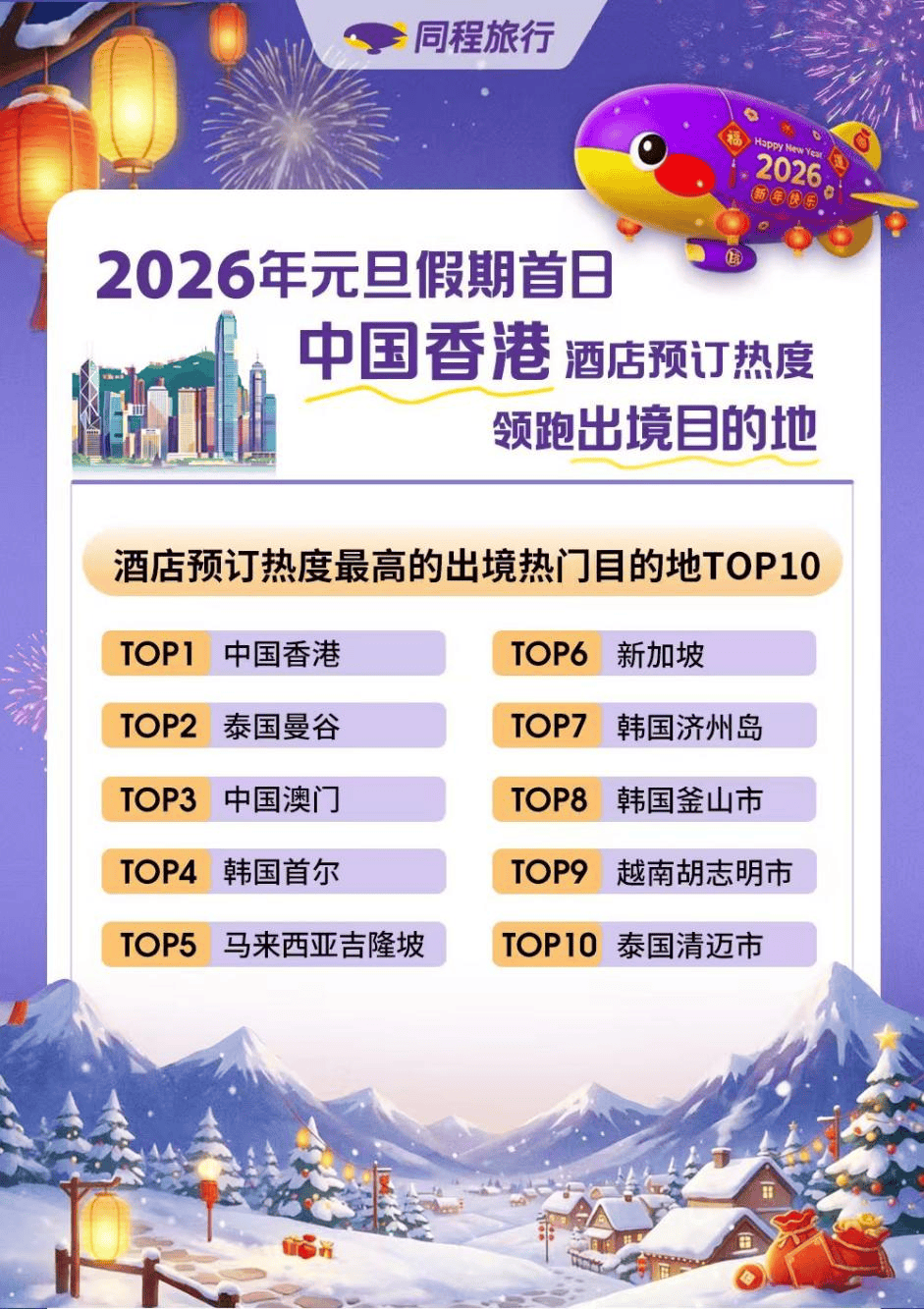 2026年元旦假期,短途出境游成为主流。同程旅行数据显示,元旦假期首日,酒店预订热度最高的出境热门目的地为:中国香港、泰国曼谷、中国澳门、韩国首尔、马来西亚吉隆坡、新加坡、韩国济州岛、韩国釜山市、越南胡志明市、泰国清迈市。其中,韩国首尔酒店预订热度同比增长超3倍,中国澳门和马来西亚吉隆坡的酒店预订热度均有1倍以上增长。
