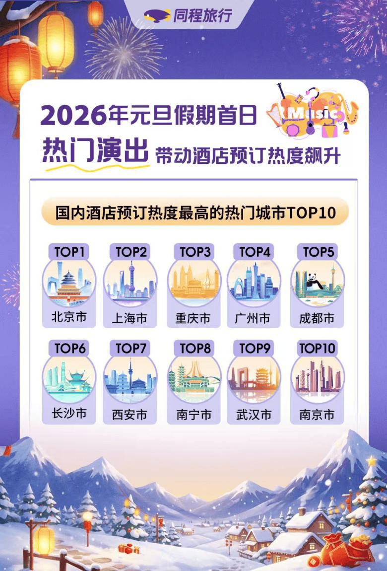 热门赛事和演出活动的举办,也拉动酒店、用车等文旅消费的增长。同程旅行数据显示,元旦假期首日,国内酒店预订热度同比增长超3倍。国内酒店预订热度最高的十大热门城市为:北京市、上海市、重庆市、广州市、成都市、长沙市、西安市、南宁市、武汉市、南京市。