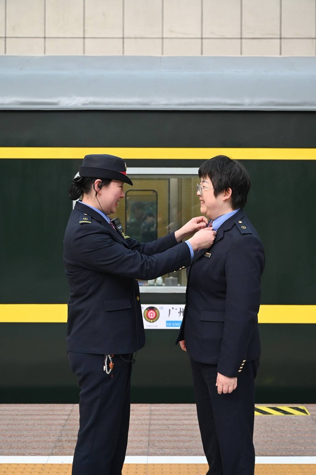 发车前,列车长李喆(左)给王韵(右)整理衣领,二人均为1997年开始在这趟车工作的铁路人。 澎湃新闻记者 吴栋 摄返回搜狐,查看更多