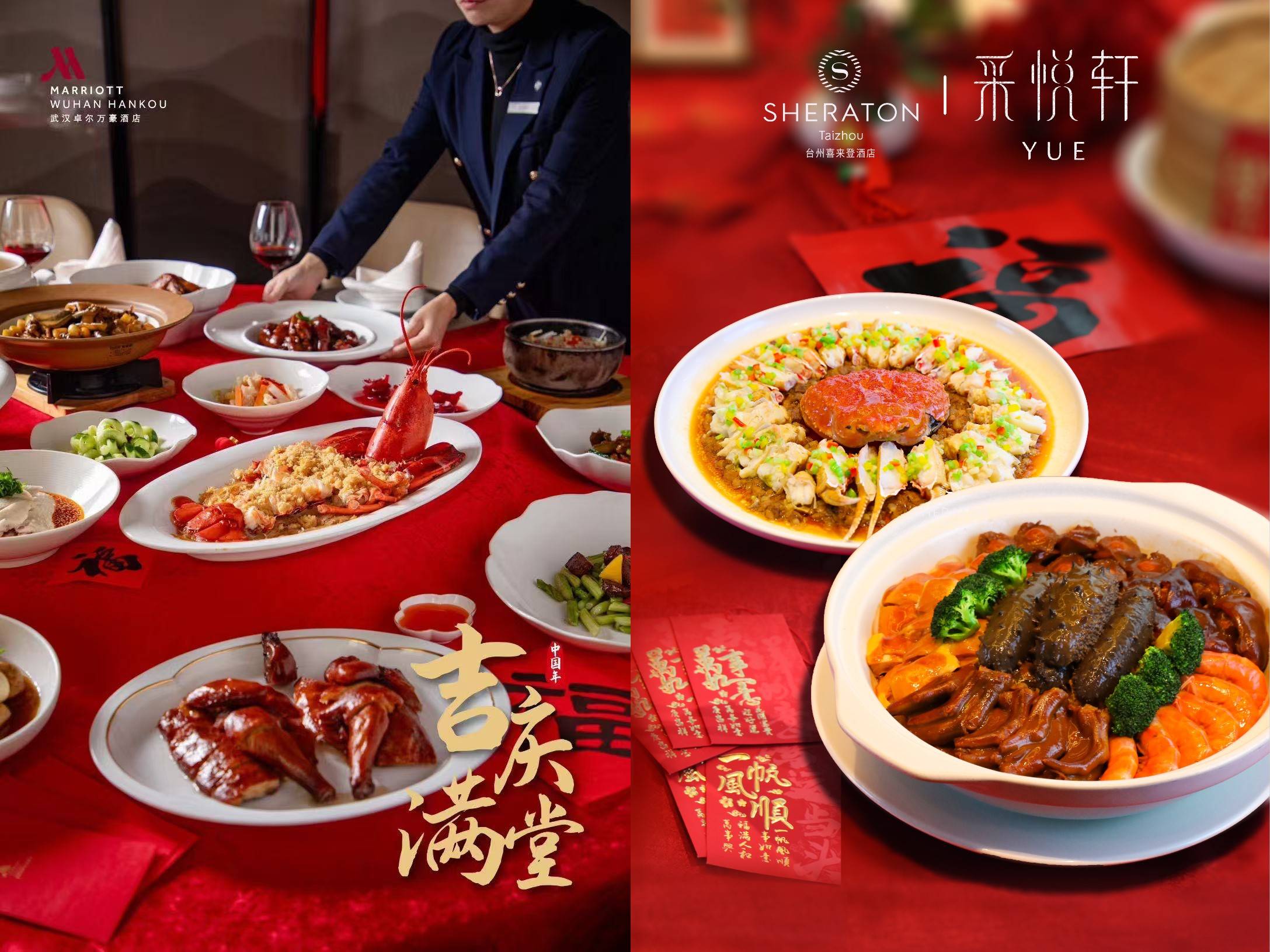 由左至右:武汉卓尔万豪酒店万悦中餐厅 “万豪鸿运宴”团年盛宴、台州喜来登酒店采悦轩中餐厅 “主厨定制”年夜菜肴