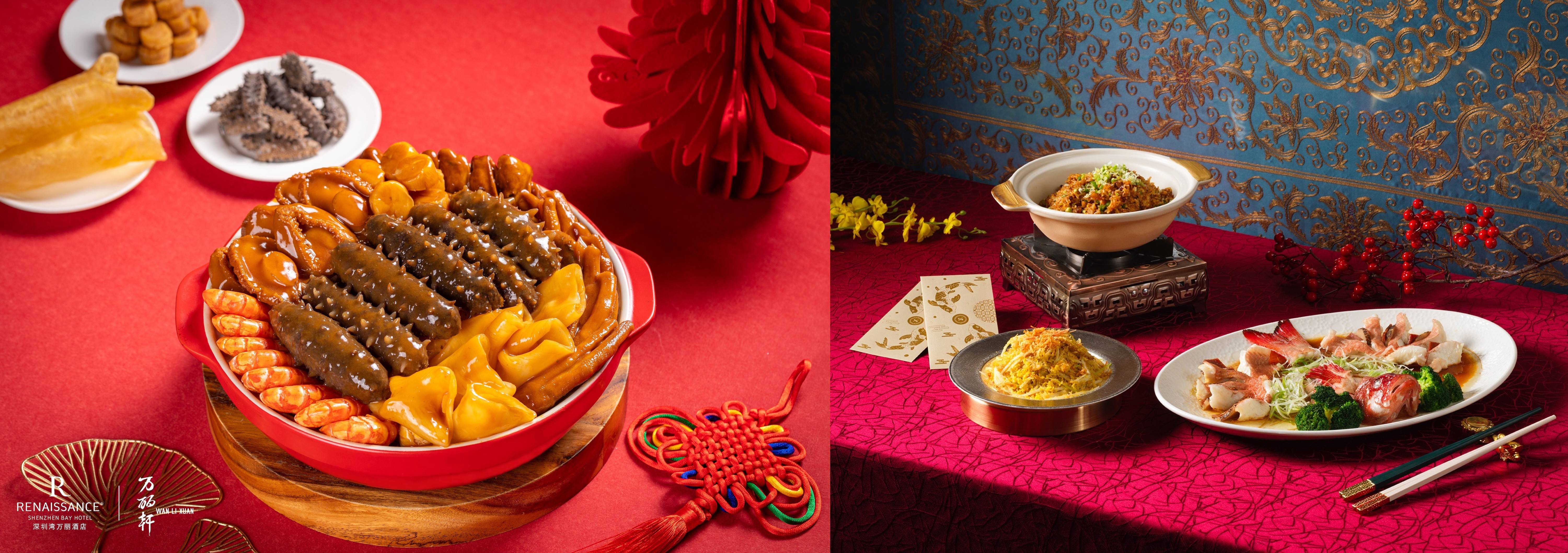 由左至右:深圳湾万丽酒店万丽轩 限定新春团圆宴、香港喜来登酒店天宝阁中菜厅 马年新春贺岁菜肴