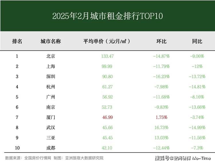 2月,重点监测TOP10城市租金环比涨9跌1。据中国房价行情网数据显示,全国租金中位数为1800元/月,环比下降1.80%,同比持平。2月,环比增幅最大的城市为厦门,涨幅1.75%;环比跌幅最大的城市是武汉,环比跌幅达到16.73%。