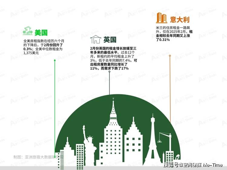 英国方面,2月份英国的租金增长放缓至三年多来的最低水平。过去12个月,新租约的平均租金上升了3%,低于去年同期的7.4%。可出租房屋数量同比增长了11%,而需求下跌了17%,部分原因是移民数量减少,和首置人士的负担能力提高。不过,根据Zoopla的数据,平均每个租盘仍然吸引12个租客争夺,较2022年至2024年的高位低42%,但仍然是疫情前水平的两倍。Zoopla预计,2025年新租约的租金将上升3-4%,其中价格较更实惠的市场,将继续保持最强劲的增长。